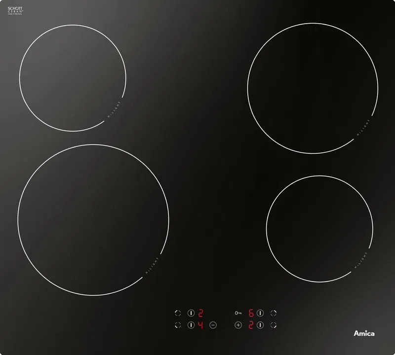 Varná deska - sklokeramická, vestavná, 4 plotýnky, dětská pojistka a ukazatel zbytkového tepla, zvuková signalizace, dotykové ovládání, rovné hrany, bez rámečku, vzhled černé sklo, povrch sklo, připojení 230 V a 400 V, rozměry 57,6 × 51,8 × 5,5 cm (Š×H×V)
