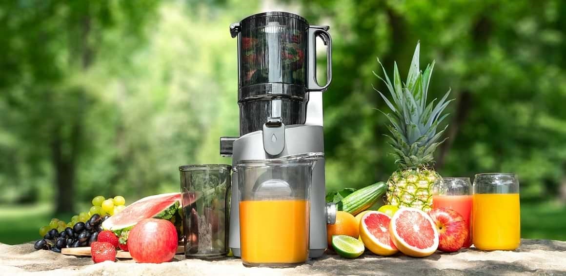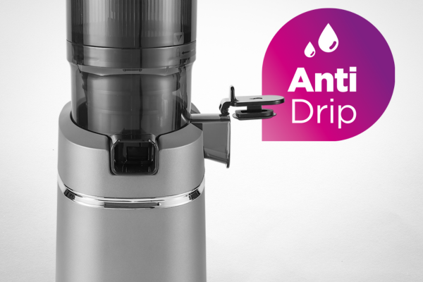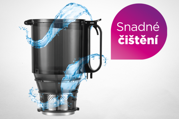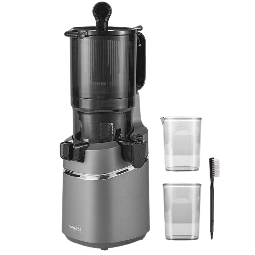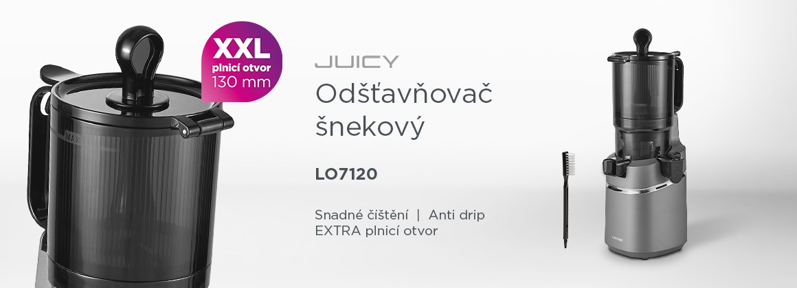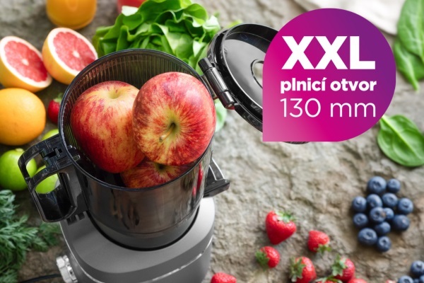 Odšťavňovač - šnekový, 65 ot./min., 1 rychlost, XXL vkládací otvor 130 mm, objem nádoby na šťávu 1 l, objem nádoby na odpad 0,8 l, Anti Drip, filtrační mikrosítko, černá a šedá barva, rozměry 43,1 × 20,8 × 20,7 cm (V׊×H)