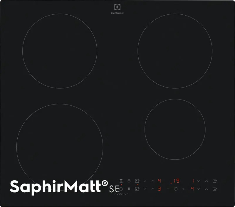 Varná deska - indukční, vestavná, 4 plotýnky, dětská pojistka, ukazatel zbytkového tepla a power management, využití zbytkového tepla, přerušení vaření a booster, zvuková signalizace, časovač a propojení desky s digestoří, dotykové ovládání, zaoblené hrany, bez rámečku, vzhled matné sklo, povrch sklo a safír, připojení 230 V a 400 V, rozměry 59 × 52 × 4,4 cm (Š×H×V)