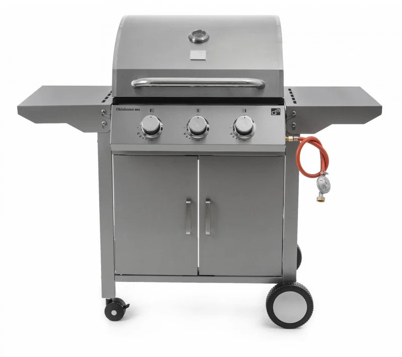 Gril - plyn, BBQ, grilovací plocha 2320 cm², rozměry 110 × 128 × 57 cm (V׊×H), materiál grilovací plochy litina, materiál grilu nerez, nepřilnavý povrch, odkapávací nádoba, odkládací plocha, poklop, regulace teploty, tepelná pojistka, teploměr a vyjímatelný rošt součástí, hmotnost 37 kg