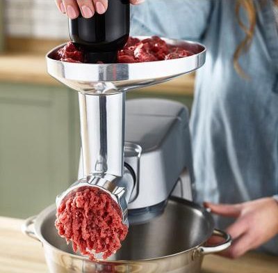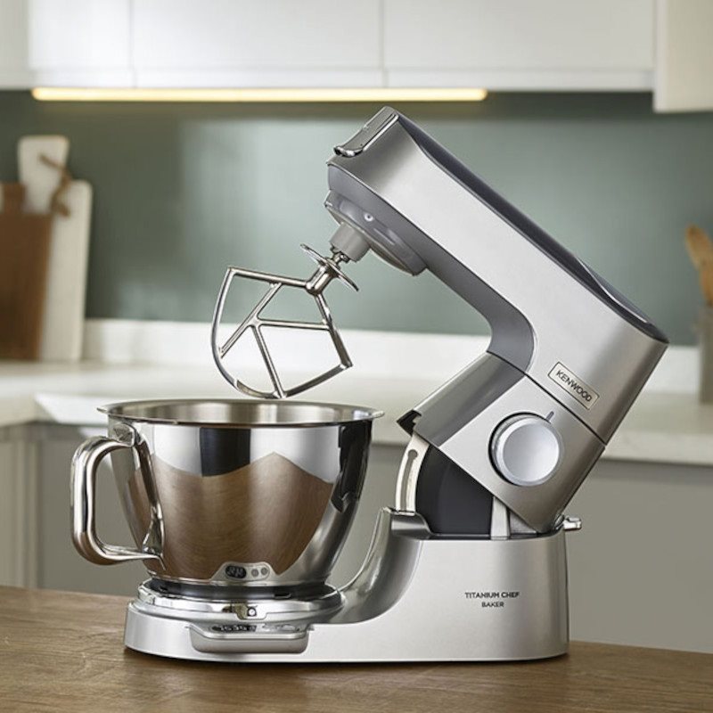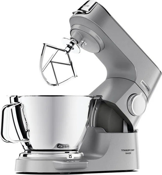 Kuchyňský robot Kenwood Titanium Chef Baker - celokovový, planetární hnětení, příkon 1200 W, kovové vnitřní převody, nerezový plášť, objem mísy 5 l, plynulá regulace otáček, s automatickými recepty, funkce šlehání, mísení a hnětení, součástí šlehací metla (balónová metla), plochá metla (flexi metla), hnětací hák, k metla, mísa, víko, hmotnost 11,71 kg, rozměry 31,5 × 39,5 × 22,5 cm (V׊×H), stříbrná barva