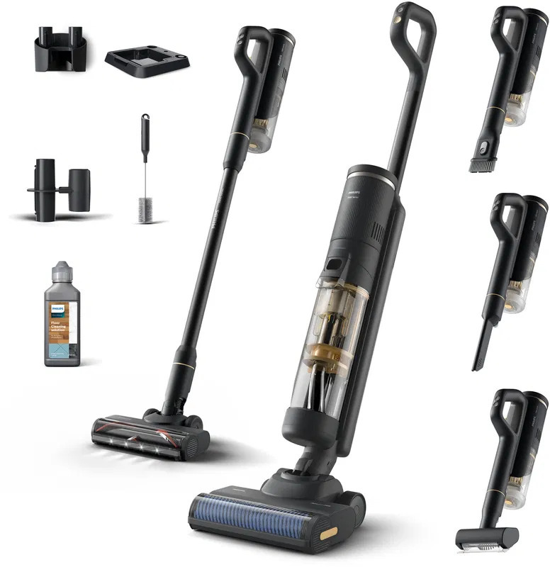 Tyčový vysavač - s mopem, 3v1, aku, na všechny druhy podlah, na zvířecí chlupy, na mokré čištění, na suché čištění, na vysávání, na Li-ion baterie, doba provozu 45 min, doba nabíjení 4 h, bez oklepu, omyvatelný filtr, příkon 160 W, hlučnost 75 dB, plastová sběrná nádoba o objemu 0,42 l, ovládání na těle, indikátor nabíjení a regulace výkonu, rozměry 116 × 25,5 × 25 cm (V׊×H), hmotnost 4,5 kg, držák na zeď, čisticí stanice a čisticí roztok součástí balení, černá a žlutá barva