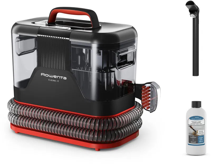 Víceúčelový vysavač - na koberce a měkké povrchy, na mokré čištění, bezsáčkový, ruční (samostatný), ruční, bezsáčkový s kabelem a tepovač, objem sběrné nádoby 1,5 l, ovládání na těle, délka kabelu 5 m, hadice, nádobka na vodu a čisticí roztok součástí balení, s kabelem, hlučnost 79,8 dB, černo-oranžová barva