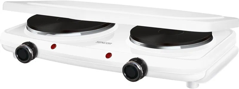 Elektrický vařič s příkonem 2500 W, počet plotýnek 2 ks, průměr plotny 18 cm, počet programů 1, termostat, ochrana proti přehřátí, protiskluzové nohy a světelný indikátor provozu, rozměry 28 cm x 48 cm x 8,2 cm, barva bílá