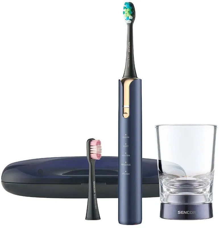 Elektrický zubní kartáček - sonický, 40000 pohybů za minutu, 5 režimů, časovač a indikátor baterie, v balení 2 hlavice, cestovní pouzdro, nabíjecí sklenice