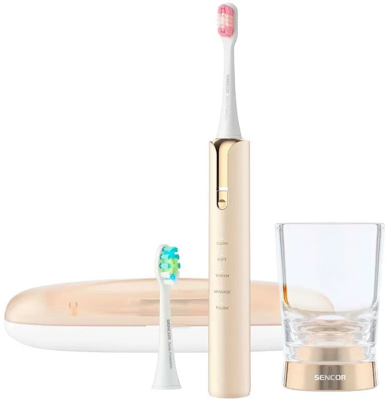 Elektrický zubní kartáček - sonický, 40000 pohybů za minutu, 5 režimů, časovač a indikátor baterie, v balení 2 hlavice, cestovní pouzdro, nabíjecí sklenice