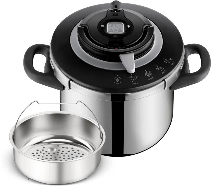 Tlakový hrnec objem 8l, materiál nerezová ocel, 4 programy (zelenina, obiloviny/luštěniny, maso a ryby), parní koš, počet bezpečnostních prvků 6, bezpečné otevírání a zavírání jednou rukou, kompatibilní se všemi typy ohřevu včetně indukce, hrnec vhodný do myčky, obsahuje kuchařku a minutku, záruka 10 let na nádobu, vyrobeno ve Francii