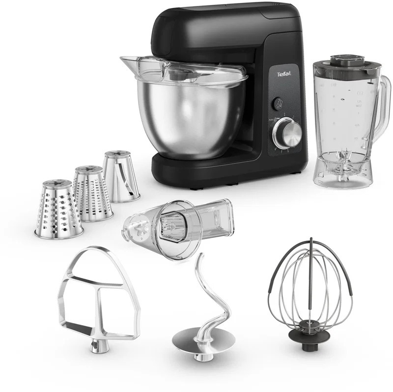 Kuchyňský robot - planetární hnětení, příkon 1100 W, kovové vnitřní převody, plastový plášť, materiál mísy nerez, objem mísy 4,6 l, 8 rychlostí, tlačítko PULSE, funkce šlehání, mísení, hnětení a mixování, součástí krouhací nástavec, kotouč na strouhání, šlehací metla (balónová metla), hnětací hák, míchací metla (stěrková metla), mixovací nádoba, víko, 3 krouhací disky, hmotnost 6,76 kg, rozměry 32,4 × 25,7 × 42,4 cm (V׊×H), černá barva