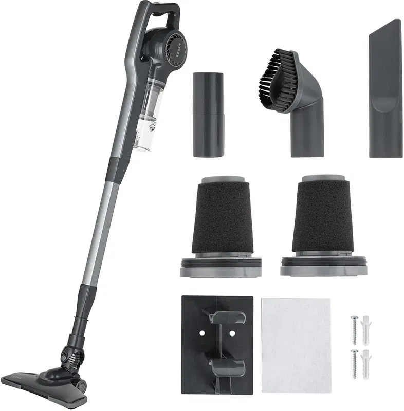Tyčový vysavač - 2v1, bezsáčkový, s kabelem, na všechny druhy podlah, na suché čištění, měkčená kolečka a omyvatelný filtr, příkon 600 W, hlučnost 80 dB, plastová sběrná nádoba o objemu 0,9 l, ovládání na těle, délka kabelu 7 m, akční rádius 8 m, rozměry 113 × 28,5 × 19,5 cm (V׊×H), hmotnost 2,2 kg, držák na zeď a filtr součástí balení, šedá barva